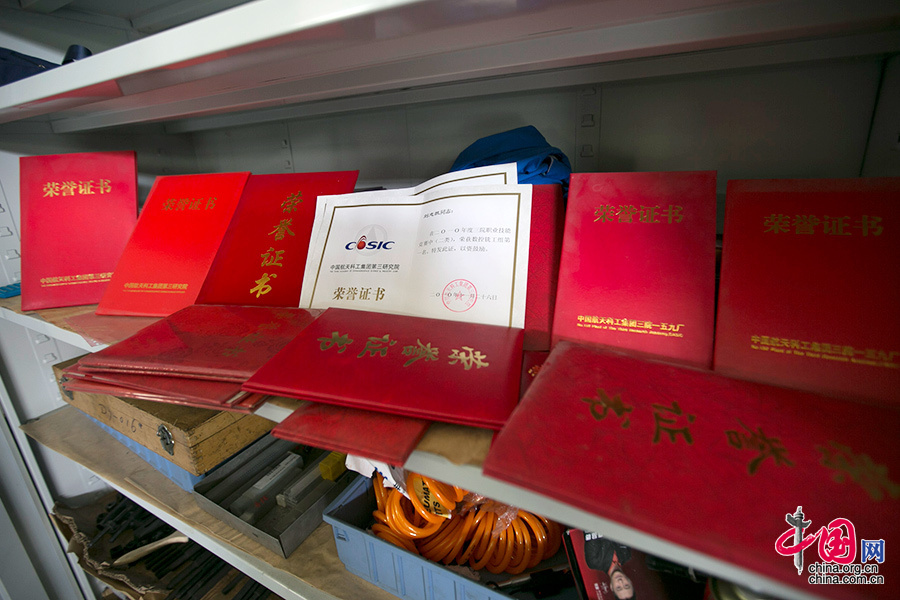 刘志凯在工作中认真负责,技艺高超,近三十年来获奖无数,他的柜子里中,摆满了各个级别的荣誉证书。因为表现优异,他曾在90年代就实地参与过导弹的靶场测试,这在七分厂零部件加工车间至今仍旧是“史上唯一的殊荣”。中国网记者 董宁摄影