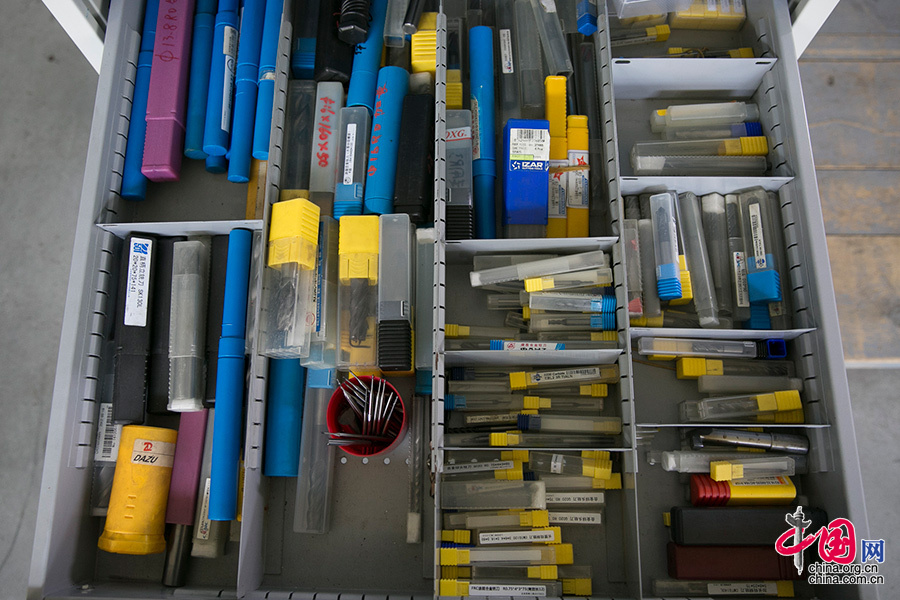 ?在机床的旁边的工作柜中,放置着几百把工作中需要用到的各种刀具,师傅刘志凯经常教导贺潇强要把工具摆放整齐,熟悉各种刀具的性能,才能保证在工作上提高效率,提高产品合格率。中国网记者 董宁摄影