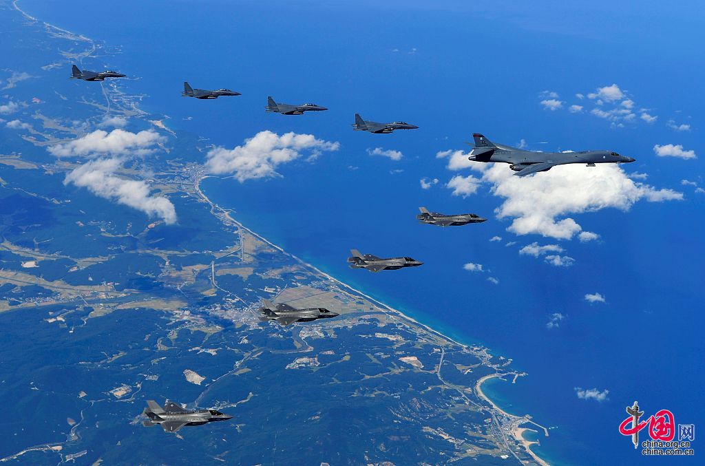 当地时间2017年9月18日,美军向朝鲜半岛上空出动2架B-1B轰炸机和4架F-35战斗机,与4架韩国战机进行了投弹演习,共投下了10枚炸弹。图片作者:HANDOUT /视觉中国
