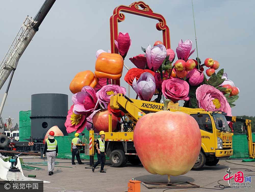 2017年9月21日,北京,天安门广场 “祝福祖国”巨型花果篮初露芳容,布置安装工作正加紧进行,吸引游客拍照留影。今年的大花篮将以喜庆的花果篮为主景,篮内摆放着柿子、石榴、苹果,以及牡丹、玉兰、月季等,今年造型将首次增加玫红色的牡丹,增加色彩效果。花篮顶高17米,篮体高15.3米,底部直径达50米。大花篮南侧写有“祝福祖国,1949-2017”,北侧写有“喜迎十九大”。预计大花篮及长安街沿线的14处花坛将在9月25日左右竣工。