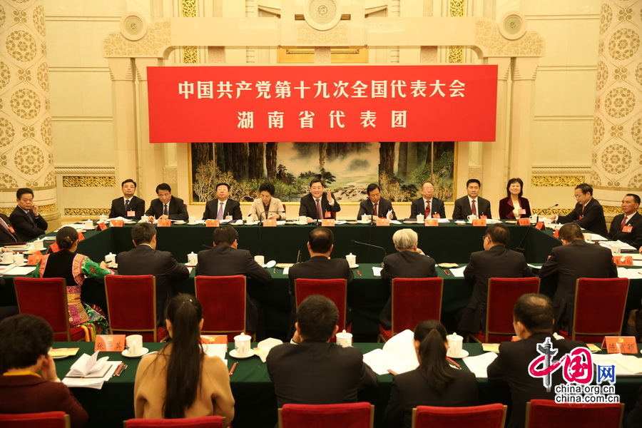 10月19日,十九大部分代表团讨论向中外记者开放。这是湖南省代表团在讨论。 人民画报 段崴摄