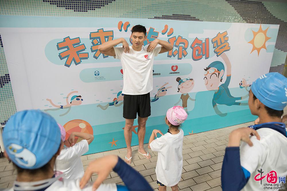 1月23日,“如新中华儿童心脏病基金慈善救助项目”在北京启动。当日下午,基金青春公益大使宁泽涛在为公益救助康复儿童教授游泳课。宁泽涛带领孩子们一起热身。 中国网 杨佳 摄影
