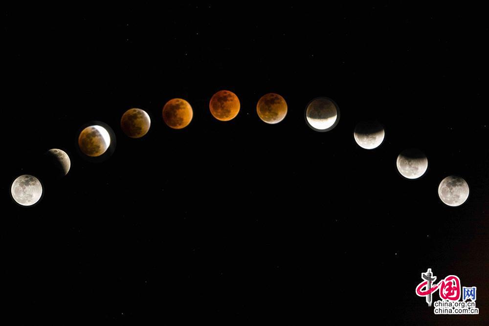 这是1月31日晚在河北省张家口市张北县拍摄的整个“月全食大戏”。当日是丁酉鸡年最后一个满月夜,天空中上演月全食大戏。我国大部分地区都能欣赏到一轮“红月亮”高悬夜空的迷人景象。(后期合成) 中国网记者 董宁摄影