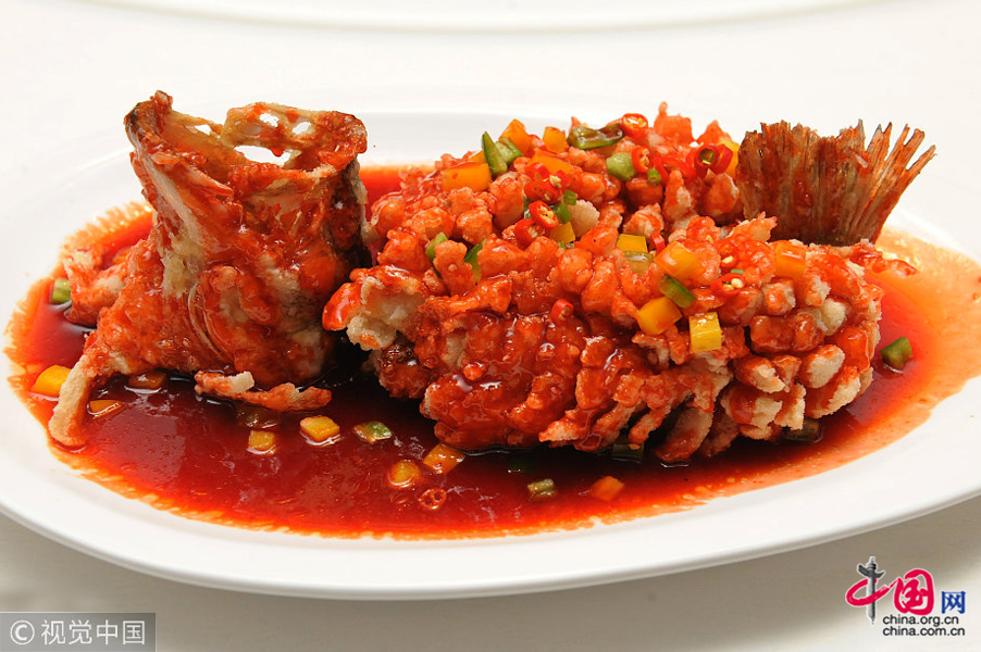 松鼠桂鱼是江苏苏州地区的汉族传统名菜,在江南各地一直将其列作宴席上的上品佳肴,在海内外久享盛誉。这道菜有色有香,有味有形,更让人感兴趣的还有声。当炸好的犹如"松鼠"的桂鱼上桌时,随即浇上热气腾腾的卤汁,它便吱吱地"叫"起来,活像一只真松鼠。