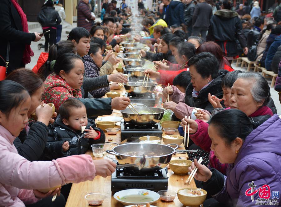 2018年2月3日,贵州省榕江县城古州石板古街,人们共享庖汤长桌宴。当天,贵州省榕江县城古州石板古街举行“山河故里味觉古州”迎立春活动,期间开展千人同享泡汤宴、老街老图片、看老电影等活动,呈现浓浓年味。(刘进银摄)