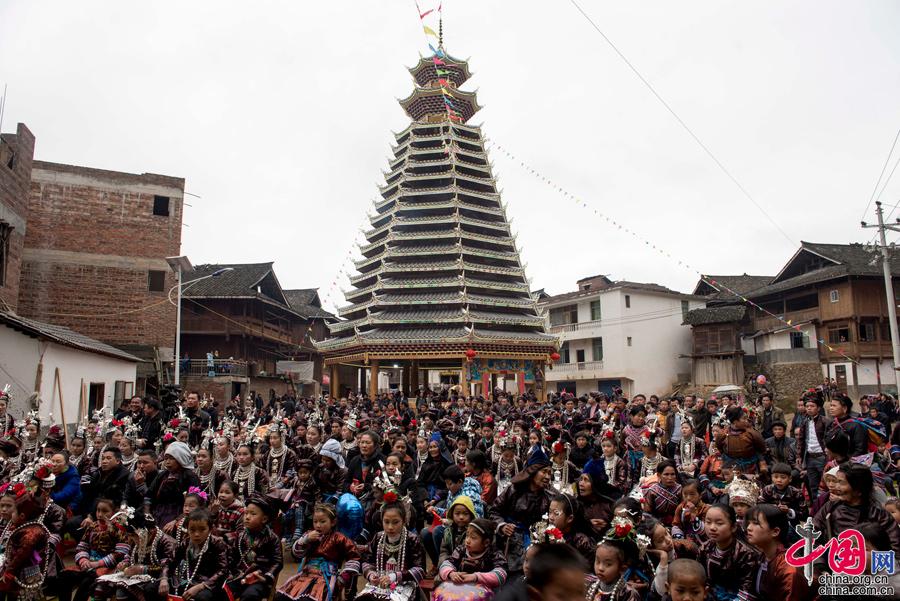 1月24日,贵州省从江县谷坪乡五一村举行新鼓楼落成庆典,当地侗族同胞邀请周边村寨群众前来联欢,举行拦路迎宾、吃百家宴、唱侗族大歌、吹芦笙等方式,庆祝新鼓楼落成,迎接春节。 鼓楼是侗族地区的标志性建筑,是侗族村寨的集中议事和文娱活动场所,每逢节日和喜庆活动时,侗族同胞都会齐聚鼓楼庆祝。(吴德军摄)