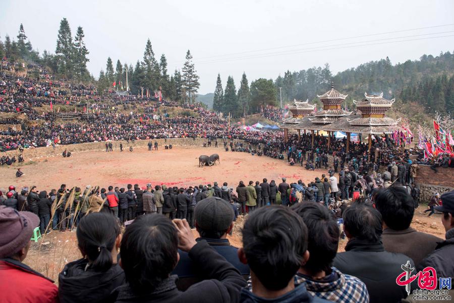 2018年1月31日,在贵州省黔东南苗族侗族自治州从江县,人们正在观看斗牛。 当日,贵州省黔东南苗族侗族自治州从江县举办迎新春斗牛民俗活动,当地的70头牛王展开激烈角逐,精彩的比赛引来成千上万观众前来观看,大家欢聚一堂,喜迎新春佳节的到来。(吴德军摄)