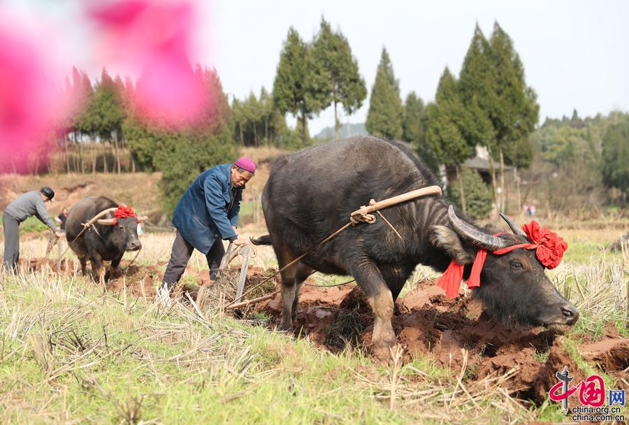 2018年2月2日,广安区郑山乡长生村的农民 ,赶着头戴大红花的犍壮耕牛来到田间, 一边翻耕农田,一边鞭打春牛吆喝:“第一鞭风调雨顺,第二鞭五谷丰登,第三鞭六畜兴旺,第四鞭高照福星。”。 长生村的老农向世阳介绍,他们举办“犁春牛”活动,表示冬闲已经过去,农忙从此开始,不误农时,辛勤耕作,才能换来五谷丰登。邱海鹰摄