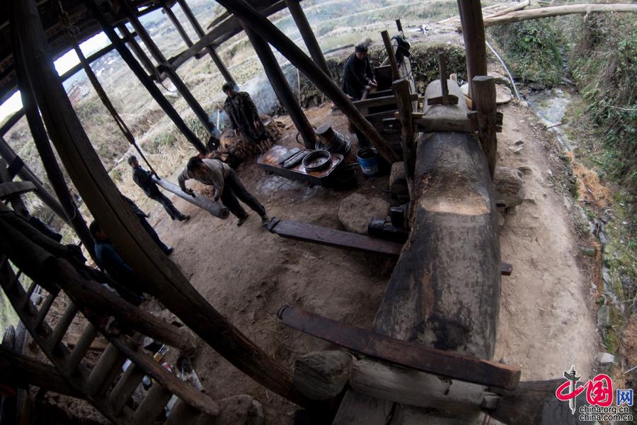 2018年2月1日,在贵州黔东南苗族侗族自治州从江县庆云镇转珠侗寨,两名侗族同胞在挥舞撞锤猛击楔子,通过传统的木笼榨榨茶油。随着惜春佳节临近,在庆云镇转珠村村民们纷纷把从山上采摘下来的茶籽精选送到榨油坊用传统方式榨茶油,榨出的茶油保留了原始茶油古朴的纯香,让远离乡村的城市人找到曾经的乡愁味道,营造出浓浓的年味。(吴德军摄)