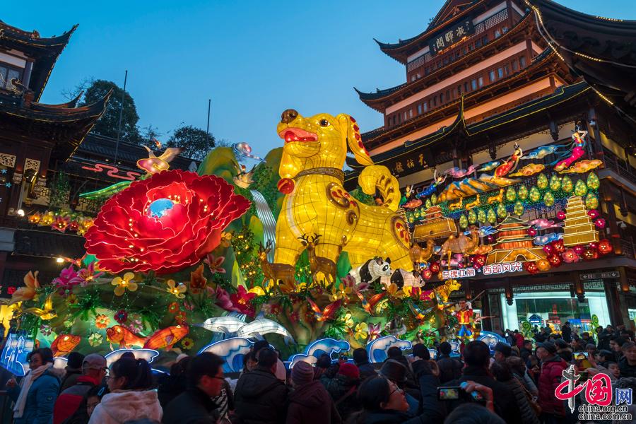 2018年2月5日,上海, 2018豫园狗年灯会本月1日正式亮灯,中心广场上的金狗主灯高9米,重达1吨,分外抢眼。当天傍晚,众多游客和市民来到豫园赏灯,大家纷纷使用相机和手机拍下美丽的灯饰场景。今年是生肖狗年,豫园中心广上海的主灯---巨型金狗高9米,相当于三层楼高度,重量达1吨,金狗灯饰定时会发出“旺旺旺”的叫声。主题灯背景绿水青山代表生态和谐、环境优美,与大熊猫、白鳍豚等共同构成了一幅鸟语花香、自然和谐的美好画卷。