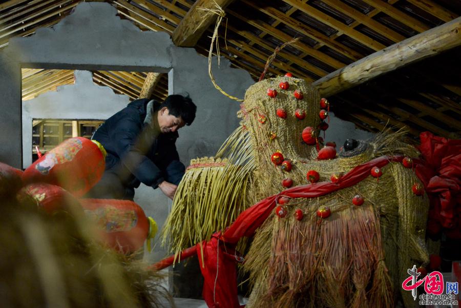 2018年2月1日上午,浙江省桐庐县百江镇百江村,民间艺人吴根强在精心装扮稻草龙的龙头。为新春佳节上街巡演做好准备工作。稻草龙是桐庐县非遗项目,有着100余年的历史,采用独轮车推动草龙,一班人肩挑箩筐、背抬谷仓,敲锣打鼓的形式上街表演,深受当地群众的欢迎。(徐军勇摄)