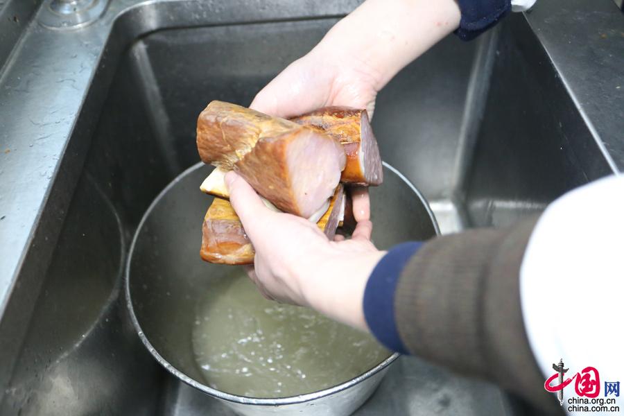 厨师长田进正在对香肠腊肉进行清洗,保证菜品卫生。