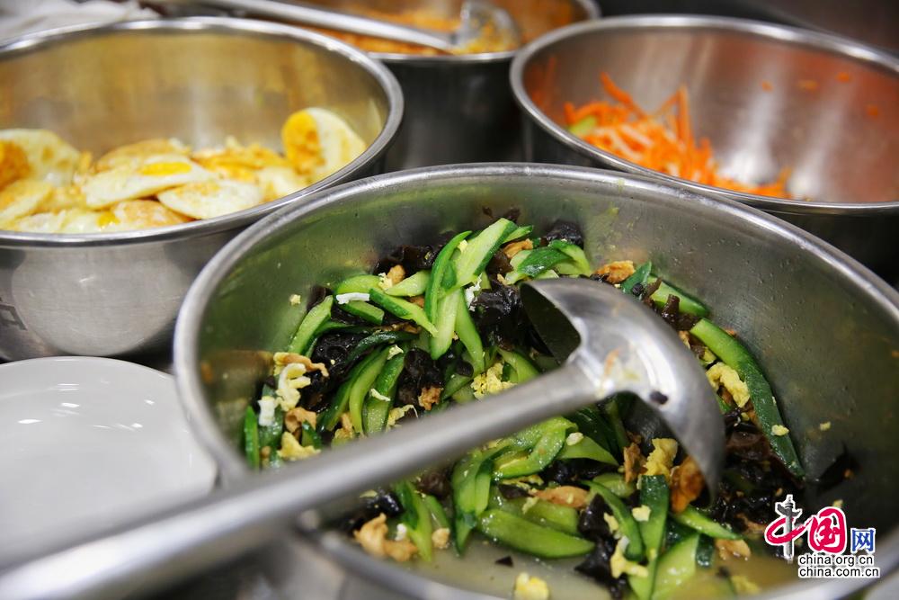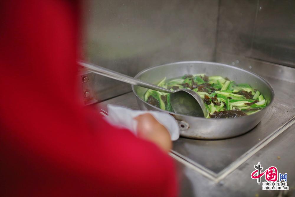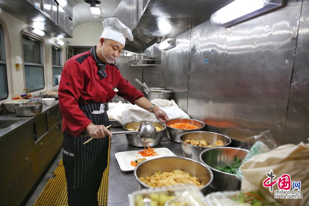为了让乘客热热乎乎的吃一口,餐车上提供的餐食基本都是现炒现卖。因为餐车的便利条件,只要车上有原料又不太忙的时候,基本可以满足乘客点菜的需求。“曾经有个山东老太太坐咱们这趟车,就想吃盘酱瓜炒肉,咱有肉有黄瓜,既然老太太点了咱就试着做一个,没有酱瓜就用酱油先把黄瓜腌一会儿让味道接近,最后老太太吃的也算顺口,咱也没白辛苦。”郭师傅这样回忆道。中国网记者 郑亮摄