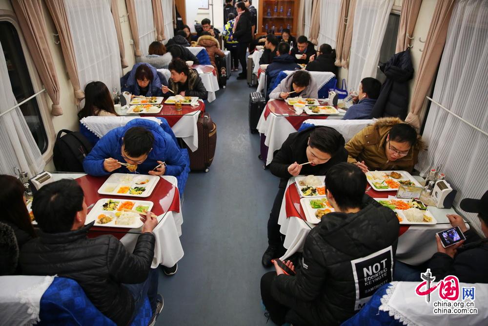 客车驶出车站,餐车的厨房就变得忙碌起来,“全副武装”的师傅们忙着炒菜配菜,冒着热气的套餐从窗口被送到乘客的餐桌上。郭师傅告诉我们,春节期间除了做饺子外,还经常会在套餐里加上一个白菜,老话讲白菜谐音为“百财”,有着聚财招财、财源广进的寓意,就是为了图个吉利。如果让餐车的服务员知道有过生日的乘客,他们会为乘客煮一碗面条,送上一份祝福。中国网记者 郑亮摄