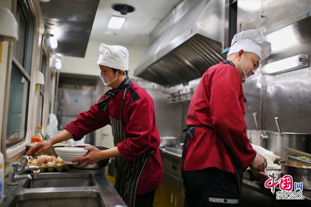 为了让乘客吃着放心,送餐的时候口罩手套也是必备品。餐车上的乘务员常说的就是:“咱干的就是这餐饮行业,保证干净卫生永远是第一位。”中国网记者 郑亮摄