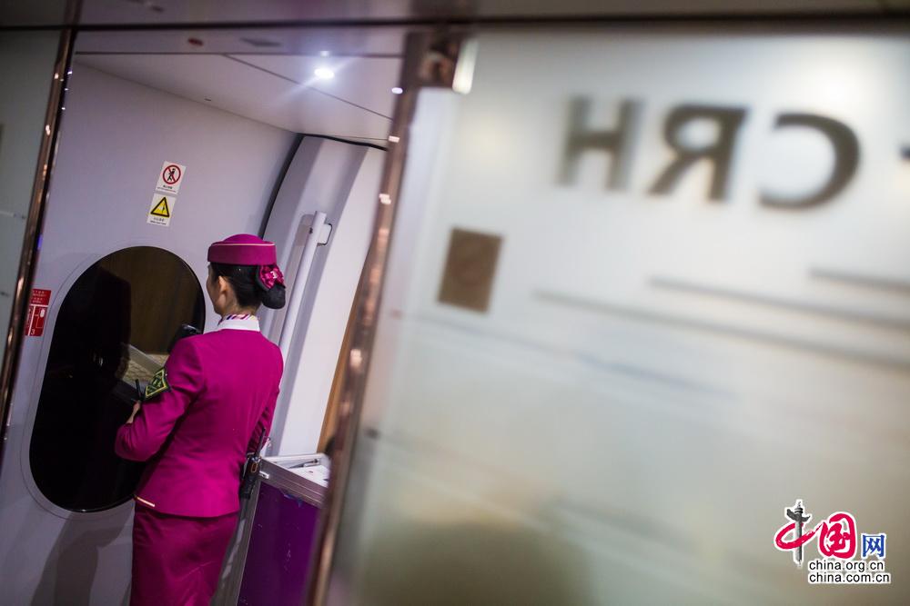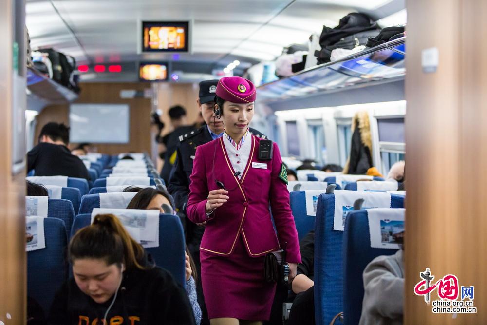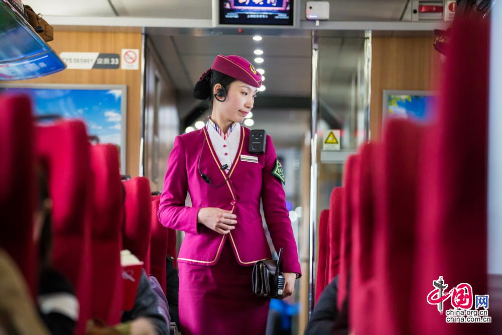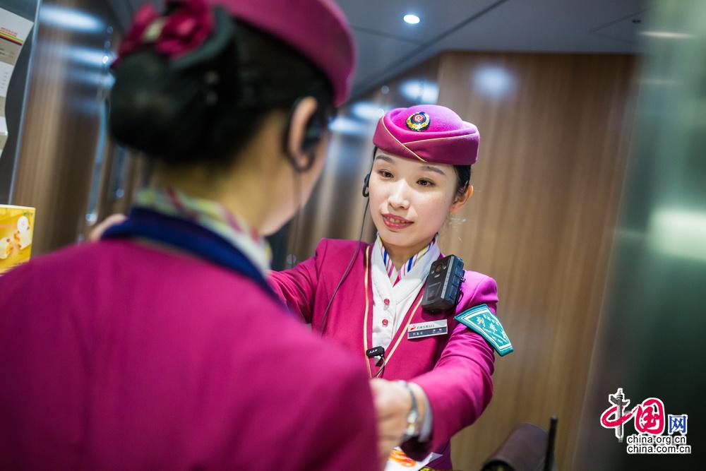 “大家好!我是石家庄客运段高铁二队的列车长高敏,从事乘务工作已经有九年了,从一来到铁路我就觉的这份工作特别熟悉,而且非常亲切。因为啊,我妈妈原来就是从事客运段餐车工作的。那时候,她总是给我讲很多列车上的故事,让我一直很向往这身制服,现在工作在这里也算是一份延续和承袭,也感觉特别荣幸。”中国网记者 郑亮摄