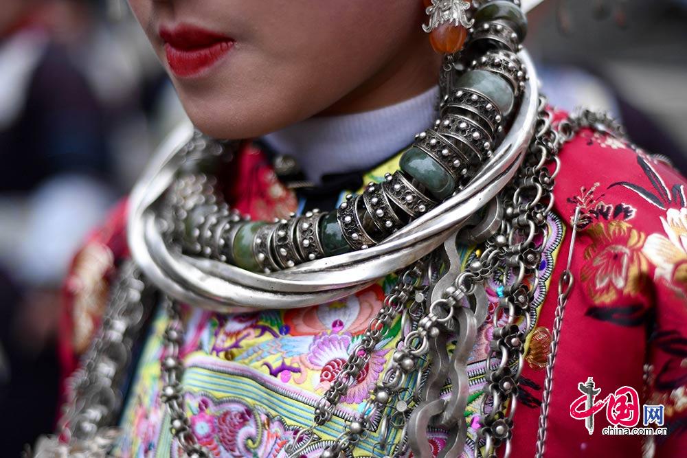 2018年2月7日,贵州省榕江县乐里镇岑勒侗寨,盛装踩芦笙堂的侗族姑娘脖上的颈饰。王炳真 摄影