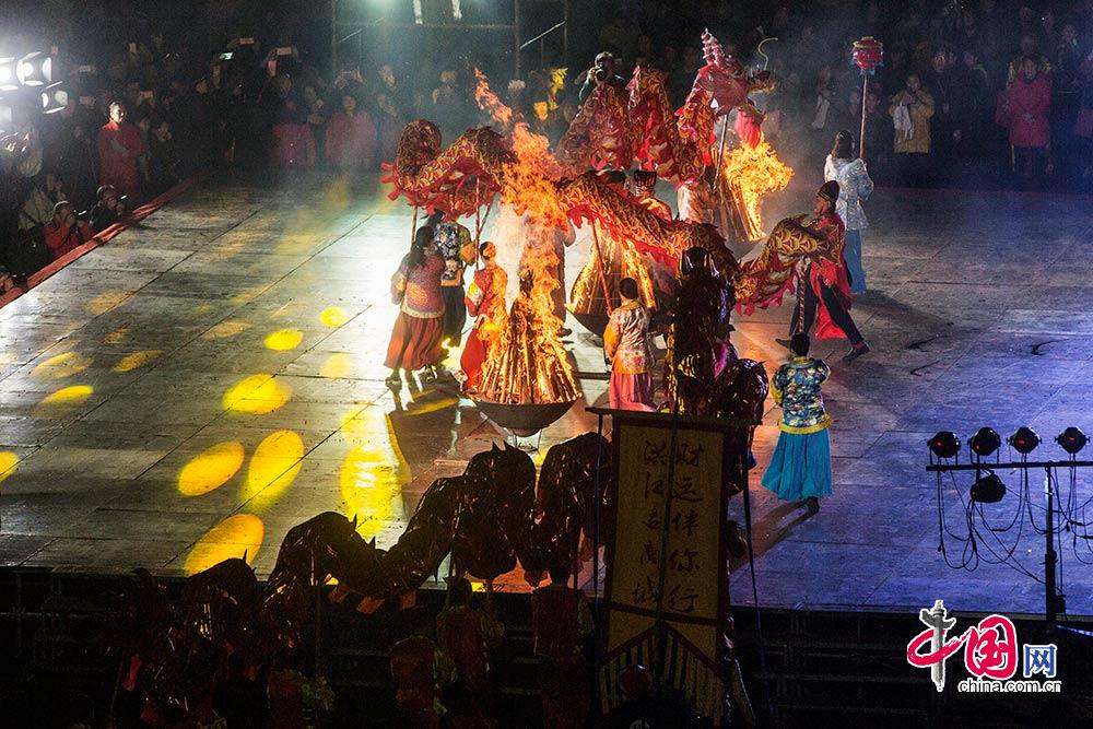 最后,100只龙狮集中在广场设坛祭祀,通过“烧龙”“过火”等程序,燃炮送龙飞升,以祈求国泰民安,风调雨顺。范洪摄影