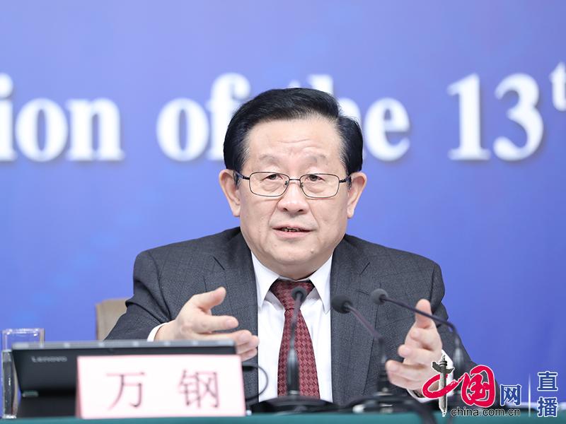 3月10日,十三届全国人大一次会议新闻中心在梅地亚中心多功能厅举行记者会,科技部部长万钢等就加快建设创新型国家答记者问。这是科技部部长万钢。中国网 高聪摄影