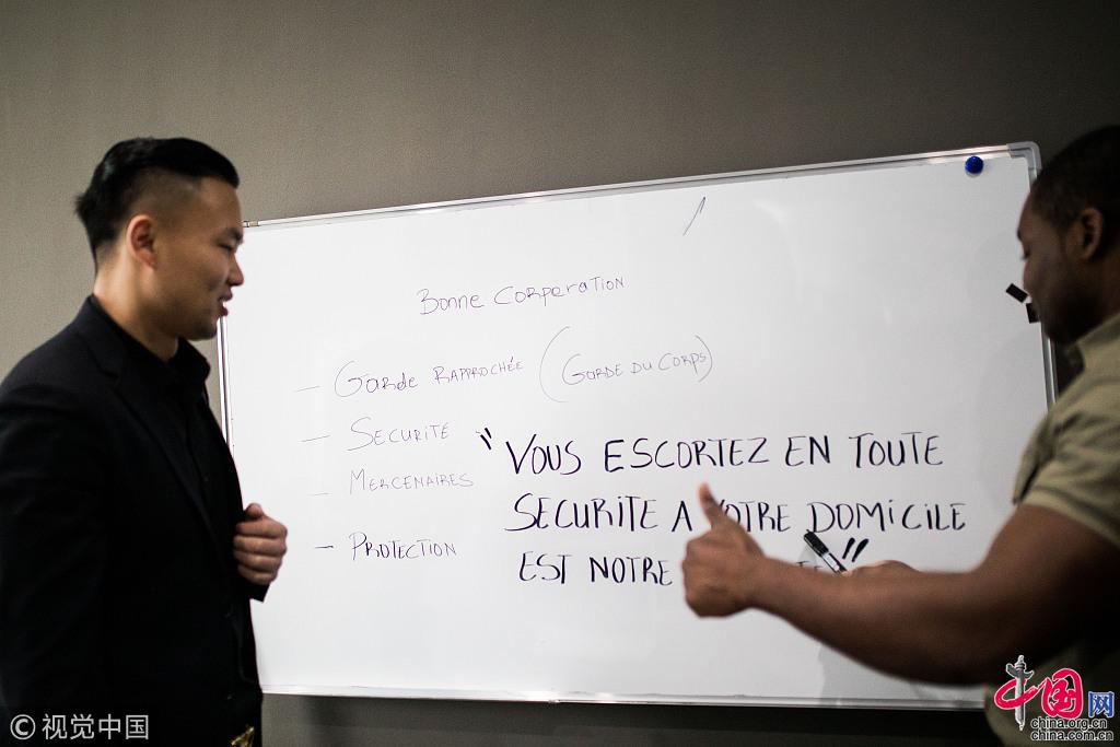 因国际业务的需要,王海春开始跟着Romaric Danda学习法语。图中的法语意思是“让你安全回家”,这也是公司的业务使命。公司建立以后,王海春和同事们保护过众多国际政要,诸如英国前首相卡梅伦、德国前总统武尔夫、法国前总理拉法兰等,还有一些企业家、明星艺人,都对他们的服务给予了非常高的评价。许康平/视觉中国