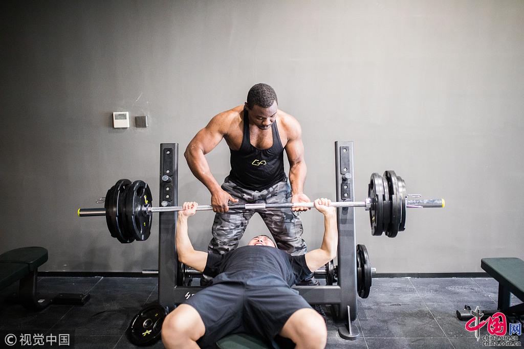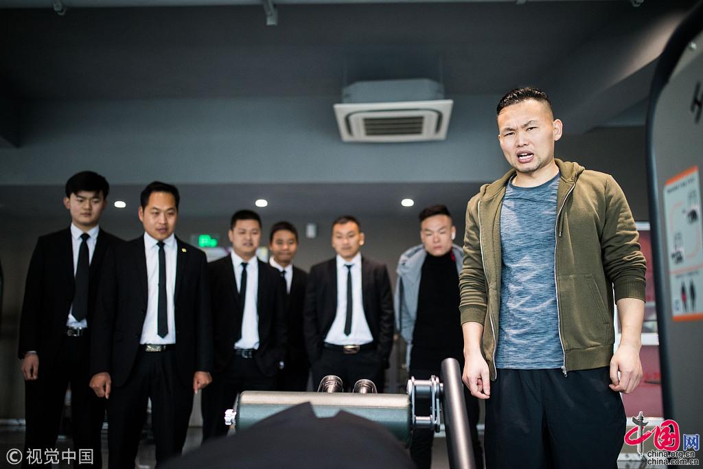 王海春八九岁就开始接触武术,高中毕业后,他一个人出去闯荡,遍访名师,先后练过拳击、散打、咏春、截拳道等,最后博采众家之长,自创了一种格斗术。这些经历为日后成为一名高级保镖,并在这个新兴的行业站稳脚跟打下基础。2017年,王海春被胡润百富榜授予“保镖行业2017未来之星”称号。图为王海春进行力量训练。许康平/视觉中国
