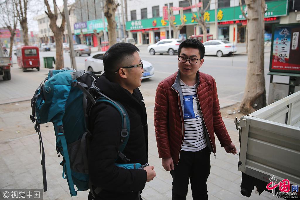 回公司的路上,王进遇到了同为雄漂一族的“背包客”魏兴亮,两人聊起了近况。 王进说,雄安汇聚了很多来自大江南北的人,大家都渴望在这里寻找各自的梦想。图片作者:王伟倩/视觉中国