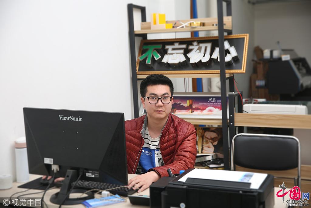 王进最终选择了留下来试试。原本计划创业不成功就先找份工作,后来发现当地工作不太好找,就开始在大街上找装修的活儿。王进讲,“2个月后,终于开张了,挣了1000块钱,特别高兴” 。一些机缘,王进结识了两位容城当地朋友,三个人合伙成立了一家设计公司,才开始逐步走向设想的创业之路。图片作者:王伟倩/视觉中国