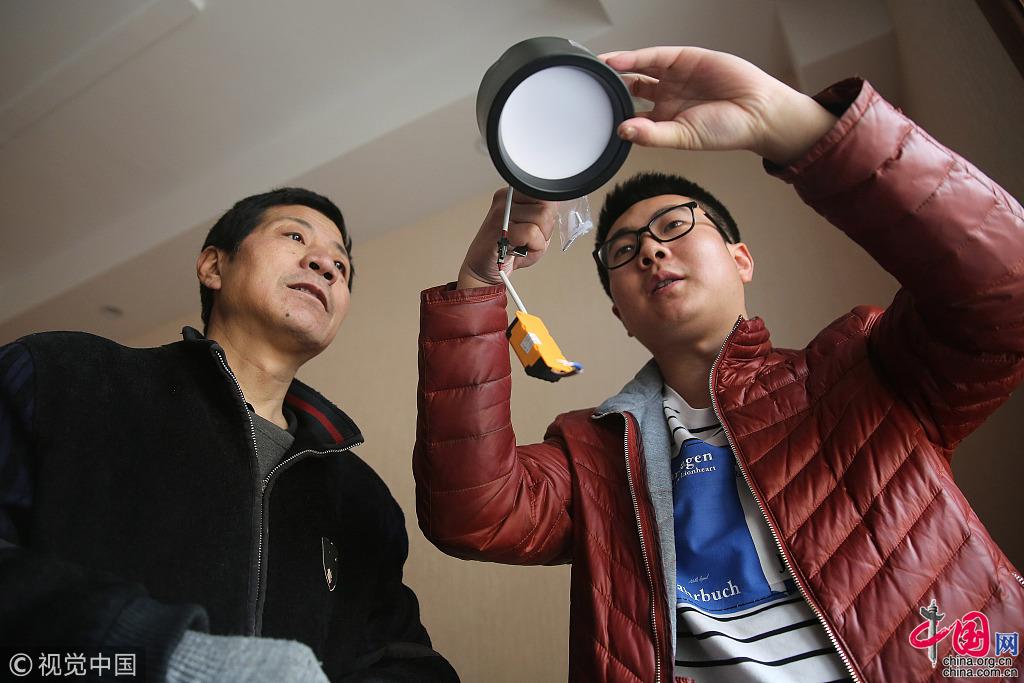 王进与装修师傅商讨施工细节。目前,王进手头上有一个咖啡厅的装修项目。每一个细节,他都希望能够精益求精。王进说,在外打拼靠的是朋友。去年年底,因为一笔工程款被压住了,他交不起房租,一位东北朋友听说他的困难主动邀请他搬过去住。 还是朋友介绍,他们的公司才获悉了当地一家企业的项目招投标计划,并顺利的拿到了工程。图片作者:王伟倩/视觉中国