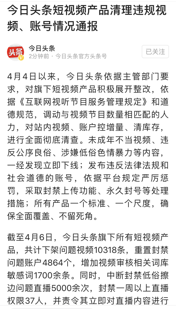 4月6日,今日头条方面发布通报,称旗下短视频产品共计下架问题视频10318条,重置封禁问题账户4864个,增加视频审核相关词库敏感词1700余条。
