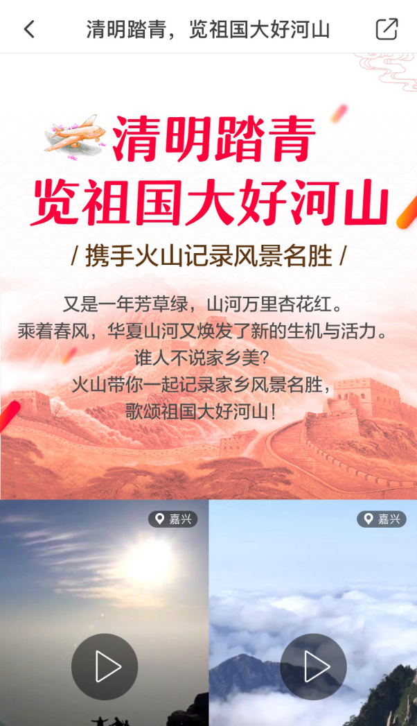 火山小视频还制作了祖国自然风光的宣传页:“清明踏青,览祖国大好河山”,将平台上记录家乡、山河风光的视频搜集整理,集中呈现。