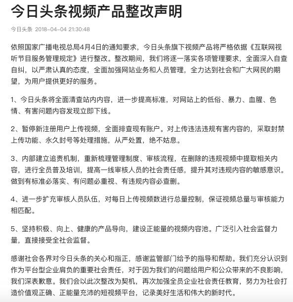 4月4日当天,今日头条发布《今日头条视频产品整改声明》,首先向广大用户致歉,并表示将逐一落实各项管理要求,全面深入自查自纠,以严肃认真的态度,全面加强网站业务和人员管理,全力达到社会和广大网民的期望,为用户提供更好的服务。