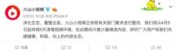 其中,火山小视频启动了全面清理行动,更新客户端首页内容,贴出“净化生态,重整出发”的通告。截至目前,下架存在问题小视频6020个,重置封禁问题账户3048个。