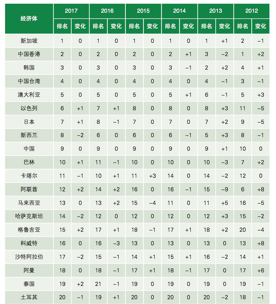 亚洲经济体 2017 年度综合竞争力评估指数排名前20的榜单
