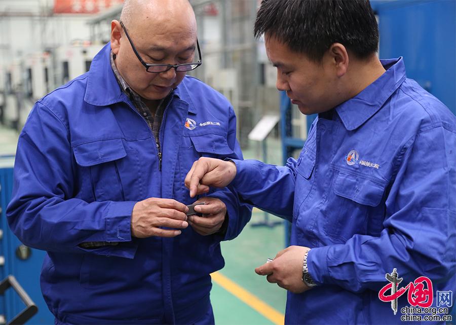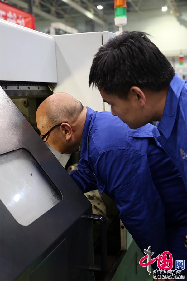 刘朝辉与师傅王保森在研讨车刀的角度。至今他都很感谢师傅,这是他进入行业的领路人。刚走出校园的刘朝辉还带着浓浓的理论色彩,不够“接地气”。然而把产品从“图纸”变为“现实”,需要不断的琢磨领悟与实践,在师傅的引导下,他发挥自己的数控特长,将书本学到的知识在平日的工作里慢慢的融会贯通,工作也越来越得心应手。手艺,就是这样代代传承、完善下来的,没有捷径。中国网记者 杨楠摄影