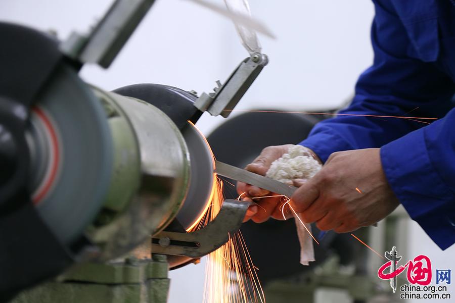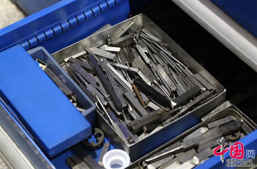 这一箱子的工具都是师傅们手工磨制的,磨刀是车工入门的基本功。刘朝辉刚入行做学徒的几个月,都是在磨刀中度过的。这项工作非常枯燥,但是必不可少。能不能通过这几个月枯燥工作的挑战,是判断一个人能否入行的重要“考核标准”。工匠所有的记忆和感觉,都在手上。中国网记者 杨楠摄影