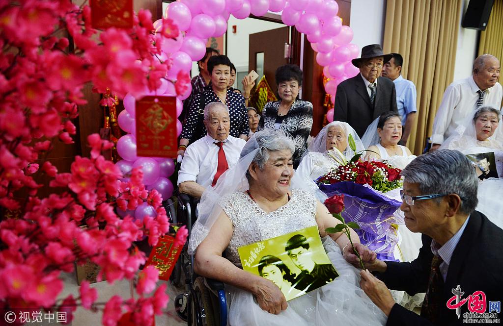2018年5月20日上午,天津南开区养老中心为在此住养的15对钻石婚夫妻举行“牵手一生,幸福相伴”庆典。图片来源:视觉中国