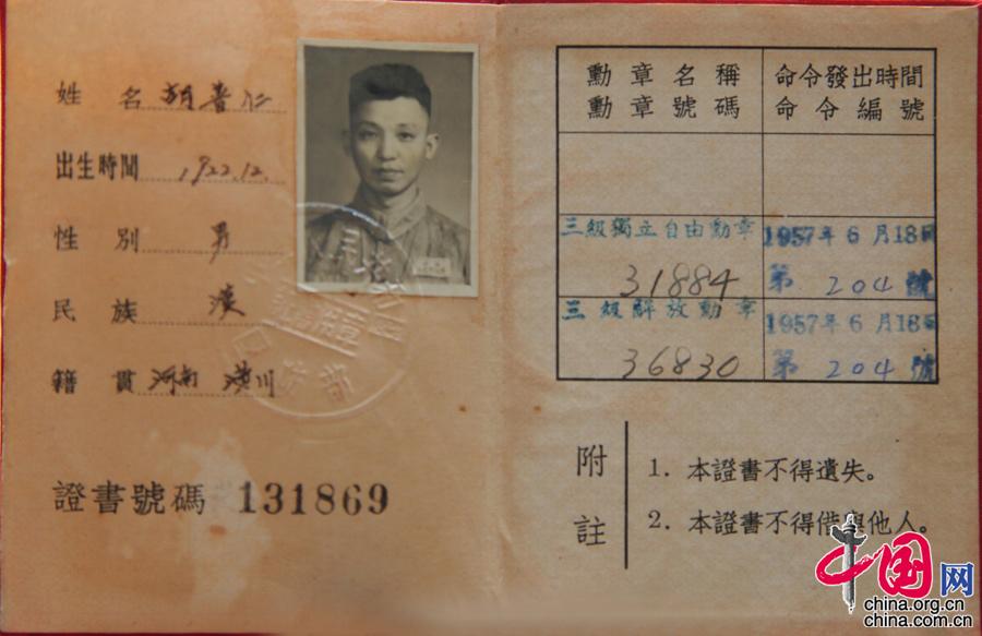 勋章证书上用繁体字记录着胡老的姓名、出生年月日等等信息,证书上的照片里老人身着军装,神采熠熠。刘一丹 摄影