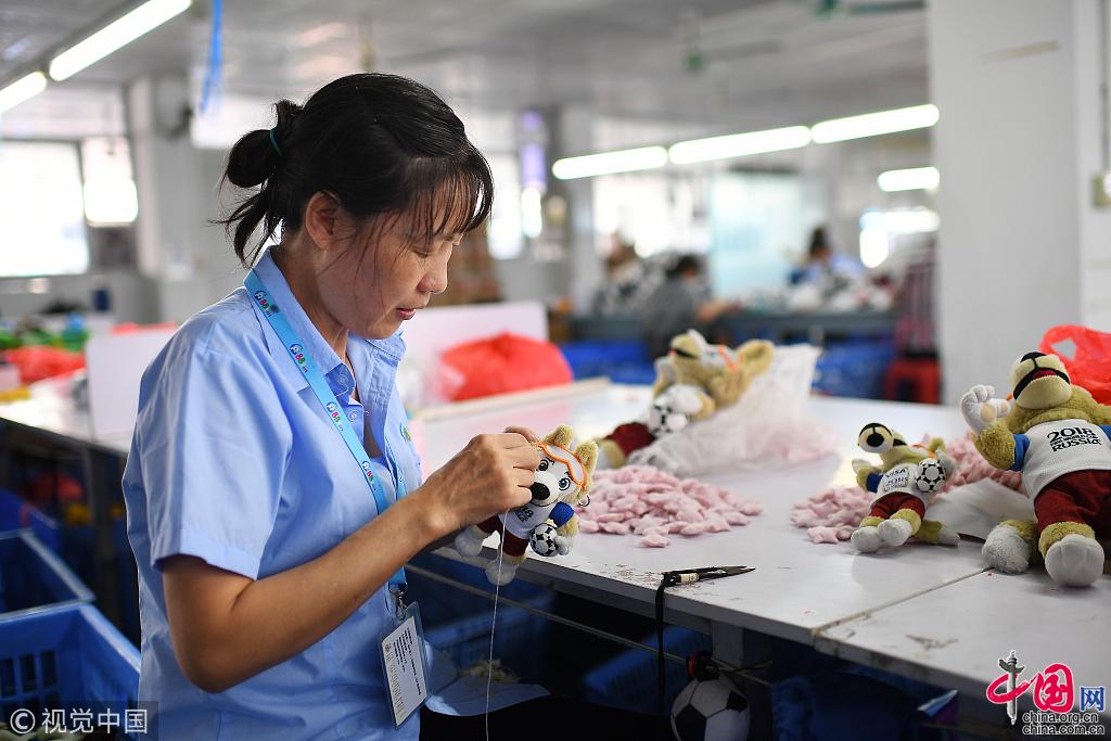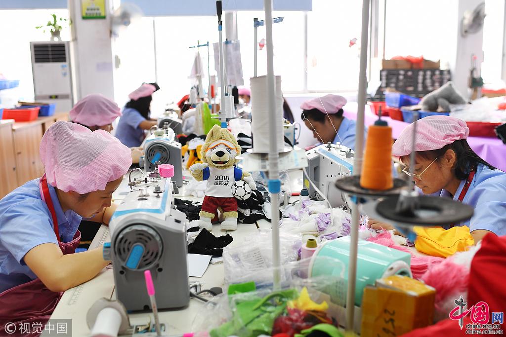 2018年4月初,玩具厂的工人们正在加班。当月,世界杯组委会发现,俄罗斯的轻工业无法生产用于开幕式等重大场合、两米高的大型吉祥物“扎比瓦卡。在Made in Internet(互联网制造)的思维逻辑下,“中国制造”的力量成功解决了这个难题。图片作者:梁清/视觉中国