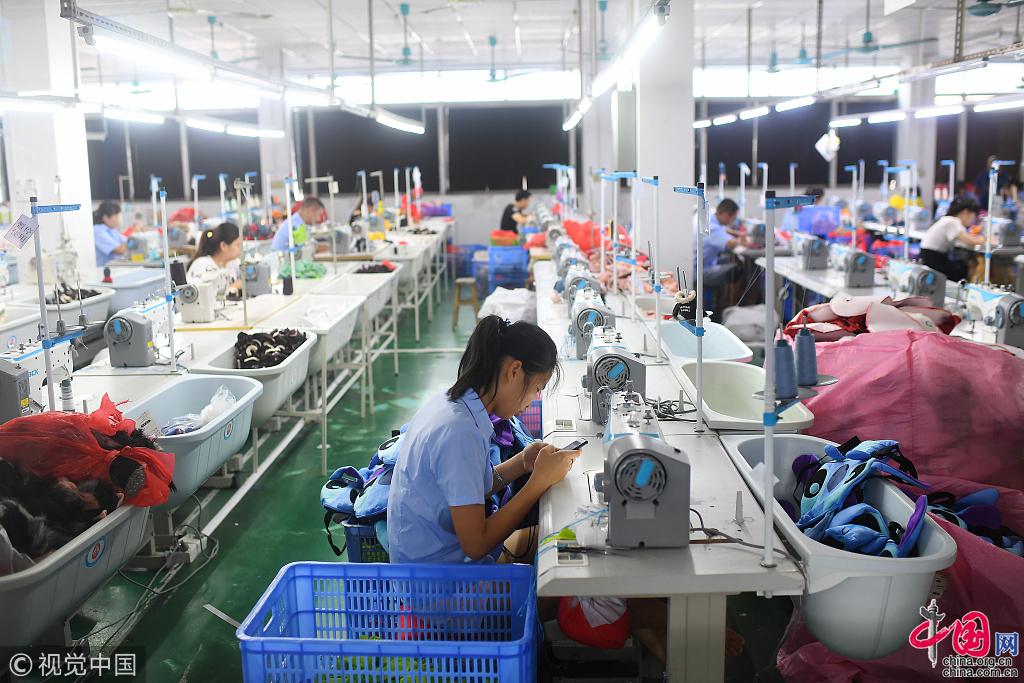 刘爱敏在车间手工缝制世界杯吉祥物。1994年,刘爱敏和丈夫来到东莞打工,24年间只跳过一次槽。她已经记不得自己缝的第一款玩具长成什么样了,但还记得自己第一月的工资:180元。图片作者:梁清/视觉中国