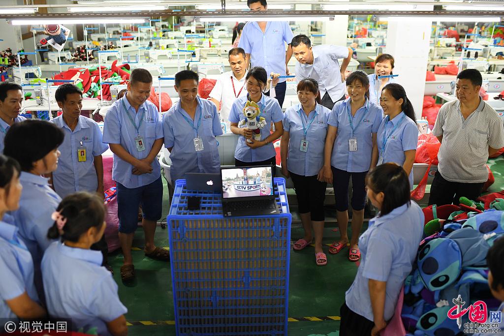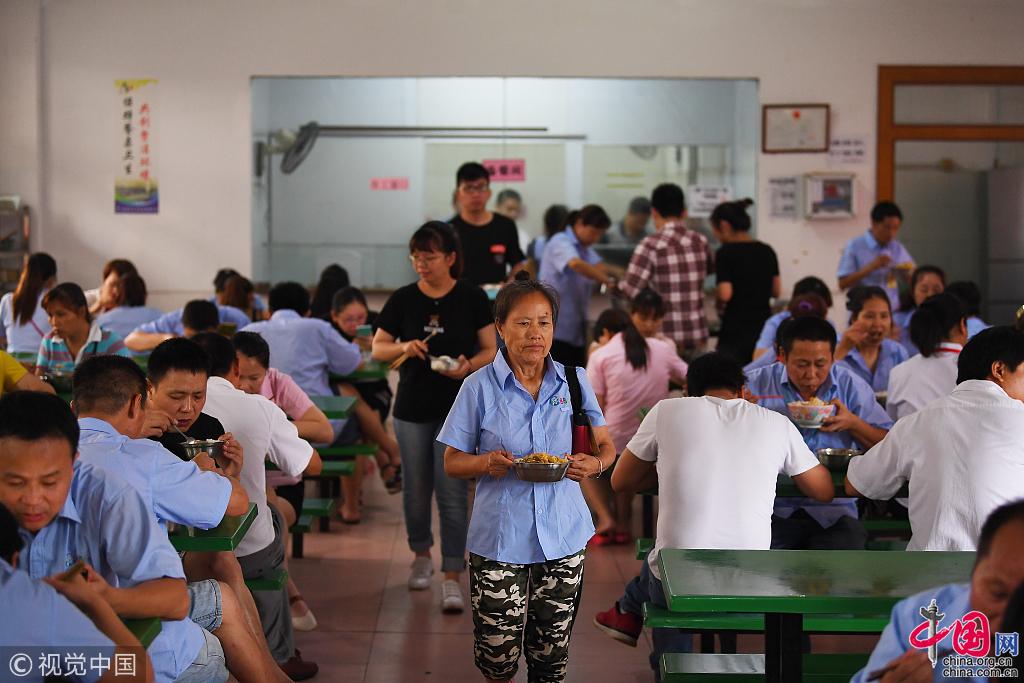缝制这些玩偶的对女工来说,十分辛苦,可能会被烟熏,还可能被工具伤到手指。而这些默默无闻的中国女工的劳动结晶,将可能与梅西、内马尔、C罗等超级巨星出现在相同的赛场,接受全世界的注目与欢呼。 “狼仔”的订单让工人们着实有些累。他们缝了二十几年的玩具,多大的订单都见过,唯独没有见过这么急的架势。忙了一上午的工人们在食堂吃午饭。常年高强度的工作,让工人们养成了快速吃饭的习惯,对于手缝女工来说,休息的时间无比珍贵。图片作者:梁清/视觉中国