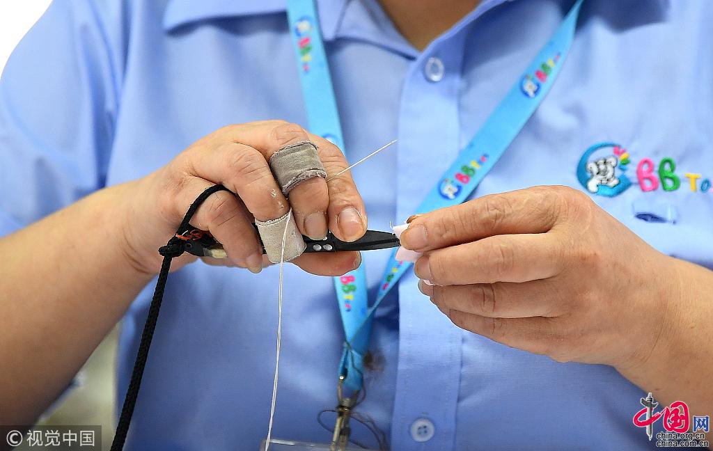 玩具厂的工人在调整用于缝制的线条。数量众多的“扎比瓦卡”要在一个月内完成,工人每天上午8点上工,夜里10点才下班。为了保密,在产品打上吊牌之前,厂里不会告诉工人毛绒玩具的名称和用途。女工们都把“扎比瓦卡”叫“狼仔”。“狼仔”的订单让工人们感到有些疲惫。订单刚来的时候,厂里叫停了生产线上所有其他玩具的生产,并调动湖南厂800个工人一起攻坚。但这群平均学历不足初中的女工也不在乎这些,这些东西在她们老板和主管的眼里只是“货”,在她们的眼里只是“活儿”。图片作者:梁清/视觉中国