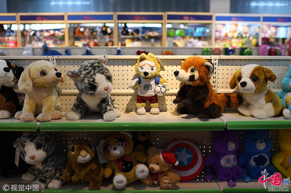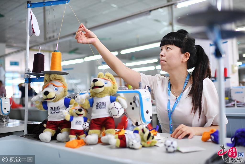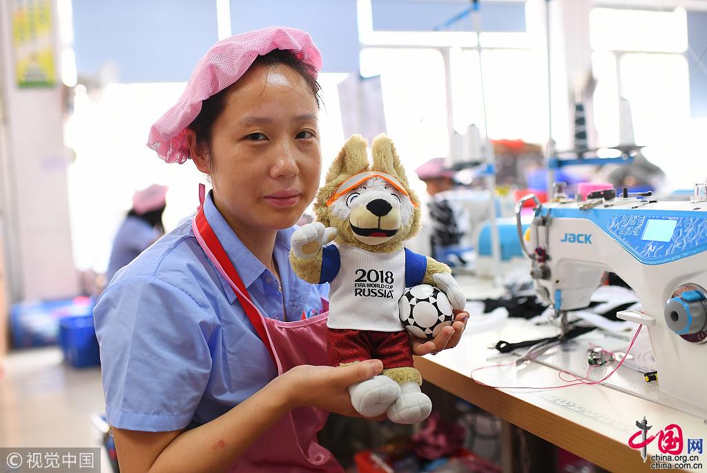 除了刘爱敏她们,还有义乌做小国旗的工人,生产世界杯纪念币的南京铸币厂工人,湖北荆州的食品厂小龙虾女工……从这个意义上来说,他们的劳动结晶,与梅西、内马尔、C罗等超级巨星的表现,都将闪耀在这届世界杯的赛场上。在工厂的样品展示厅里,“狼仔”位列其中。从临危受命到拯救世界杯组委会的吉祥物危机,中国厂商们向世界展现出了中国制造的力量。 图片作者:梁清/视觉中国