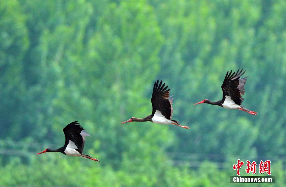 7月1日,河北石家庄平山岗南水库下游滹沱河段发现成群黑鹳,最多时达12只,黑鹳是大型涉禽,属国家一级保护动物,也是世界濒危珍禽,已被《濒危野生动植物国际贸易公约》列为濒危物种。中新社发 于英杰 摄