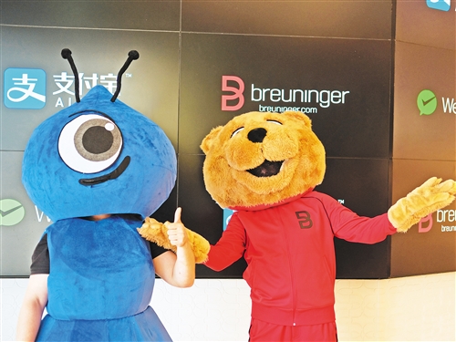 德国大型连锁零售商布罗伊宁格日前宣布,旗下全德11家百货商场全面引入中国移动支付方式支付宝和微信支付。图为在德国杜塞尔多夫布罗伊宁格百货商场,卡通人偶为商场引入中国移动支付做宣传。 (新华社发)