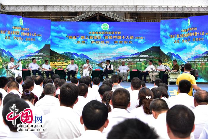 当天下午,大型电视访谈节目“两山路上看变迁,绿色中国十人谈”在庙池村村委会所在地举行。由唐守正院士、常纪文研究员、李冰主任、李人庆主任、丁忠兵博士,以及中国生态文明研究与促进会常务理事、绿色财富论坛组委会副主任兼秘书长黎祖交教授,著名表演艺术家、邓小平的扮演者卢奇等8位领导和专家组成的嘉宾团队,与本期节目主讲人——中共彭水县委书记钱建超、彭水县诸佛乡庙池农庄负责人张儒斌、担任现场主持的中央电视台主持人刘栋栋一起就“乡村振兴美丽彭水”的话题进行了现场讨论。