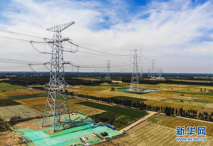 6月29日无人机拍摄的投入运营的雄安新区1000千伏定河线迁改工程。当日,雄安新区首个大型电网建设工程——1000千伏定河线迁改工程建成投入运营。该工程跨越拟建的京雄城际高铁、京港台高铁。新华社记者 李晓果 摄 图片来源:新华网