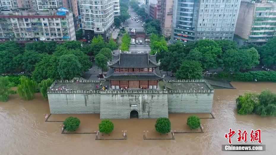 7月4日,受洪峰影响,四川泸州滨江路停车场已被完全淹没,水位线已达12.2米,沿着滨江路栽种的柳树已有半截泡在水中,长江水已经漫上滨江路单碗广场。李佑天羽 摄