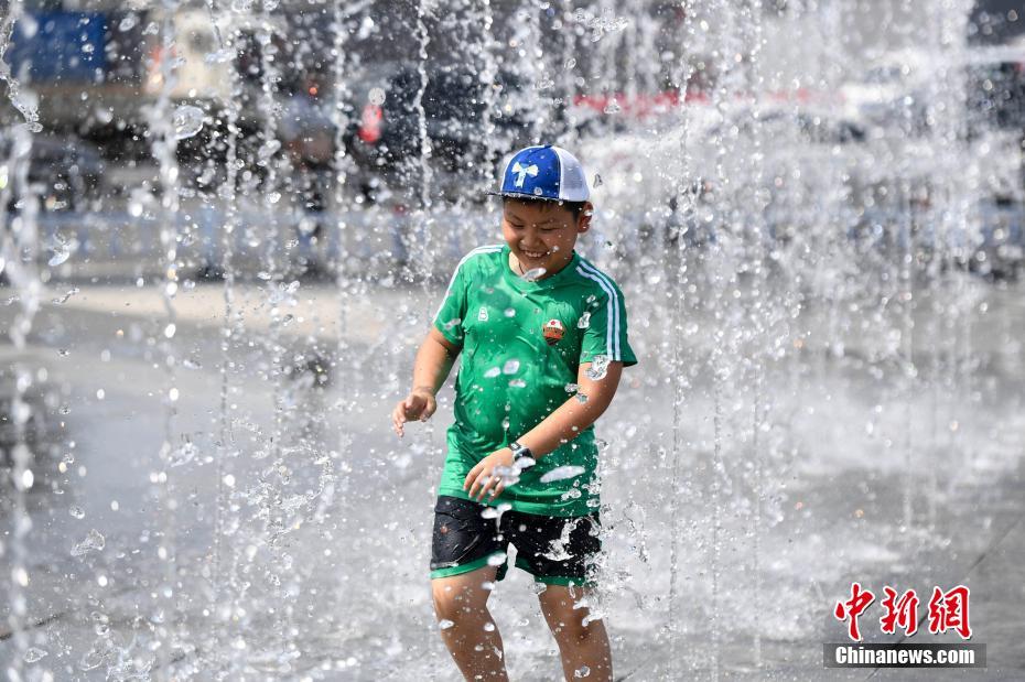 7月4日,湖南开启“热不停”模式,多个地区发布黄色高温预警信号。长沙当日最高气温达36℃,市内梅溪新天地露天喷泉吸引了众多市民前去玩水,以此躲避高温。杨华峰 摄
