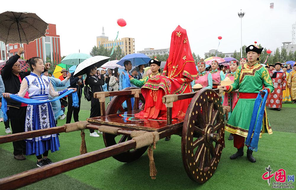 一场庄重而神圣的蒙古族接亲仪式揭开2018霍林郭勒科尔沁草原旅游婚礼节帷幕。中国网 赵娜 摄影