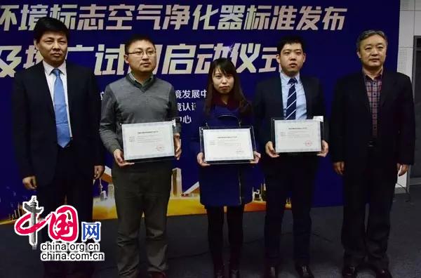 2016年12月13日,环境保护部环境发展中心在京召开中国环境标志空气净化器标准发布及推广试用启动仪式。图为环保部环境发展中心领导向三家空气净化器企业代表颁发中国环境标志产品证书,右二为TDB董事长刘文杰。